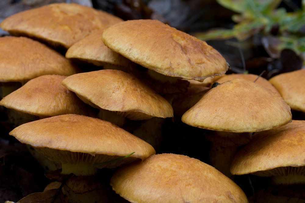 Closeup of a group of mushrooms the splendid-flowerhead or Gymnopilus junonius a mushroom in the family Hymenogastraceae, this species is quite common in autumn