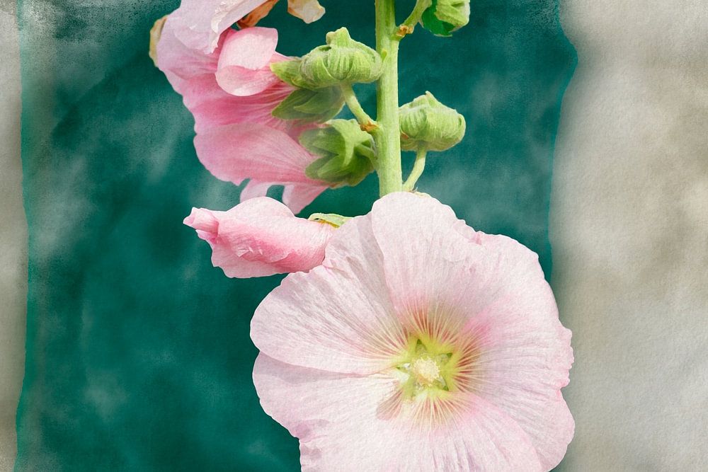 Closeup of a hollyhock in watercolour by Youri Mahieu