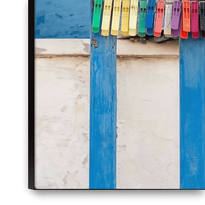 Many old clothespegs are strung together on a washing line outside on a blue wooden vintage balcony parapet in a Greek village on a Cyclades island, Greece