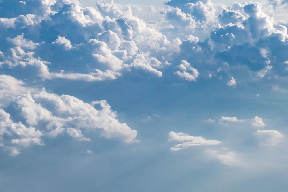 Magnificent view from high altitude over cumulus clouds that rise above a hazy layer.