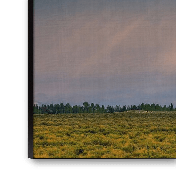 A panoramic photo of a sunrise with sun rays piercing through the clouds in Grand Teton National Park in Wyoming, USA on a cold spring morning.