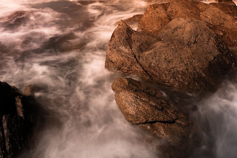 Coastline of Brittany, France, with rocks and water from the rough sea at sunset.