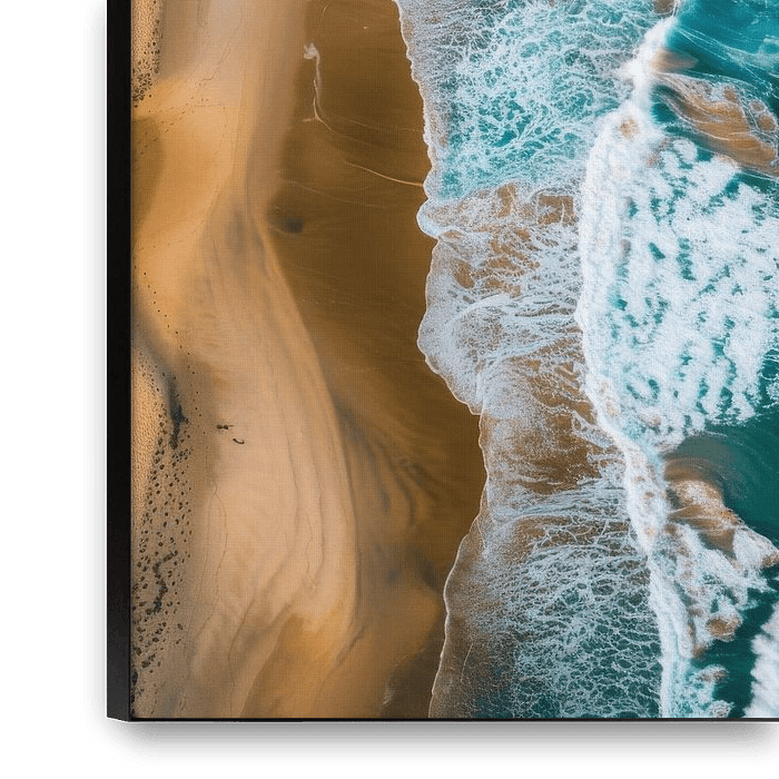 This striking image depicts dynamic waves crashing onto a golden sandy beach, capturing the majestic power of the sea. The calming blue and gold tones make this work ideal for lovers of seas and oceans, as well as those who appreciate nature motifs and landscape photography. It brings a refreshing and calming energy to your living…