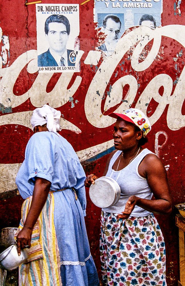 Women in front of a Coca-Cola logo in Santo Domingo / Dominican Republic in the Caribbean. The recording was made with analogue film!