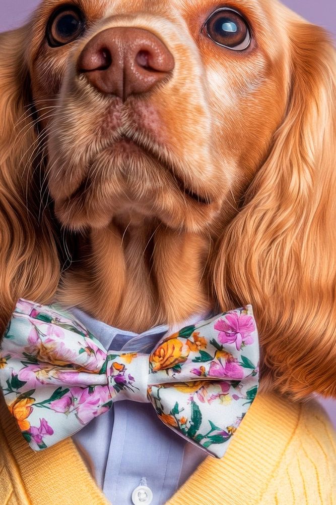 In an elegant, knitted jumper, this Cocker Spaniel radiates charming serenity. The soft, wavy ears and bright eyes give him a playful and distinctive look. His look is rounded off by the colourful bow tie - a true gentleman on four paws who enchants onlookers with his stylish appearance.