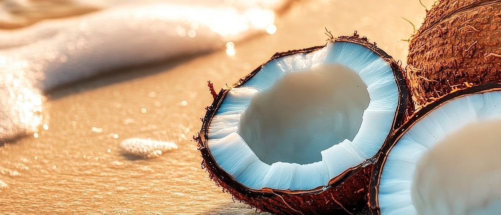 The gentle waves play around the golden sandbank, while fresh, halved coconuts add a touch of tropical exoticism. Their bright white colour contrasts perfectly with the shimmering brown of the bowl. This lively scene is ideal for the kitchen to create a holiday feeling and an ambience full of joie de vivre.