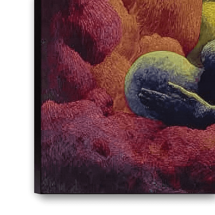 A surreal vision of a figure resting within a chamber of fiery reds and luminous yellows. The textured forms envelop the body like living clouds, creating an atmosphere of shelter, transformation, and inner silence.