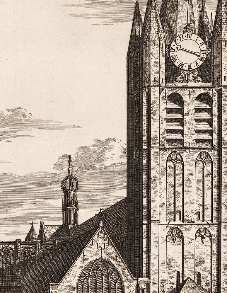 Between 1325 and 1350 a 75 metre high tower in Flemish style with a brick spire and four corner turrets was built in front of the church. At that time the tower was by far the highest building in the area. Only about a century and a half later, in 1496, the higher Nieuwe Kerk was completed,[1] a few years after the tower was built, the side aisles of the church were raised to the level of the nave. The two side choirs and the high choir also date from this period. At the end of this construction period, the church was dedicated to St Hippolytus in 1396.