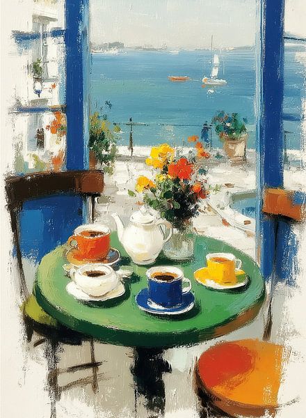 Coffee Corner | Coffee Vibes - This painting depicts a sunny coffee corner with a green table filled with colourful cups and a white teapot, while the blue sea and blooming flowers are visible in the background, evoking a cheerful atmosphere.