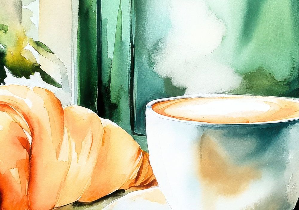 An atmospheric watercolour shows a white coffee cup on a saucer, filled with hot coffee, next to a golden-brown croissant on a silver plate. The dark wood table is illuminated by the soft light of a window with green blinds, through which slightly blurred leaves can be seen. Gentle brushstrokes and harmonious colour gradients create depth and warmth, while the composition showcases coffee and croissant as central elements. The picture conveys calm, cosiness and the atmospheric ambience of a relaxed breakfast moment.