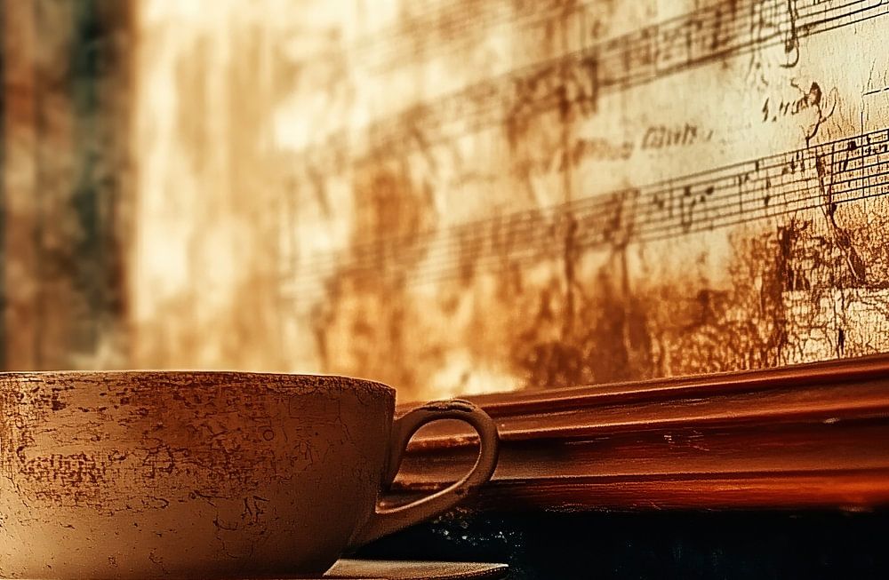 A steaming cup of coffee rests on an old, worn piano, while sheet music hangs on the wall in the background. This harmonious arrangement captures a cosy and nostalgic atmosphere, reminiscent of quiet moments full of creativity and reflection. The contrast between the warm steam of the cup and the timelessness of the piano invites you to linger and conveys the feeling of an intimate and musical setting. Ideal for art lovers and anyone who appreciates the charm of music and the romance of everyday life.