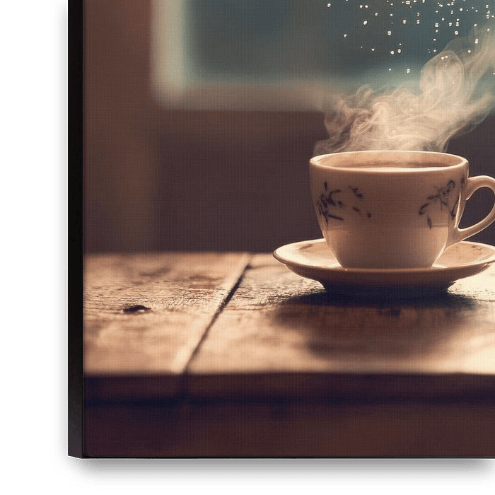A coffee cup becomes the scene of a magical weather phenomenon: a cloud-like apparition hovers above it, from which gentle raindrops fall. Clouds of vapour mingle with the gentle rain, while the light creates a dreamlike atmosphere. Here, pleasure and nature combine in a mysterious dance. An artistic interplay of the elements!