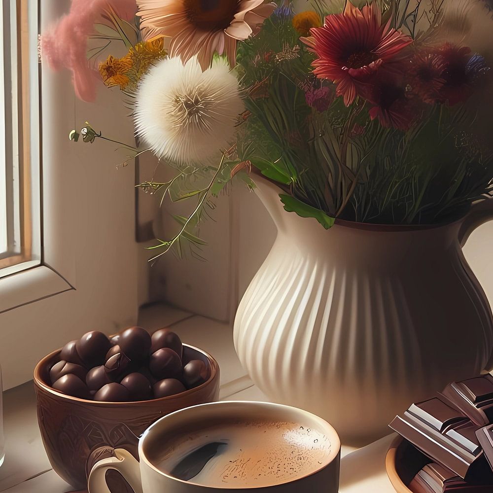 Buy this flower art Coffee with chocolate and flowers by Tatjana Korneeva on canvas, ArtFrame, poster and wallpaper, printed on demand in high quality.