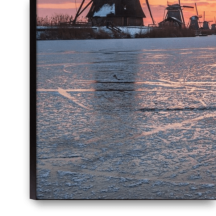 Sunrise between the windmills of kinderdijk on a cold february morning.