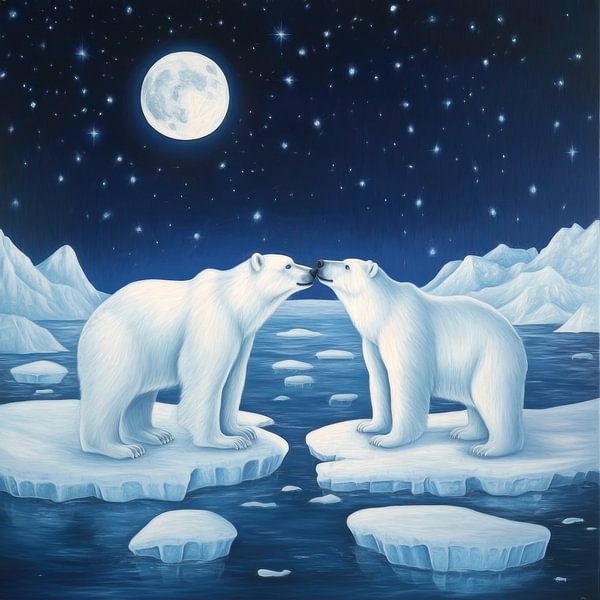 Two polar bears stand on separate ice floes in an arctic landscape, the night sky illuminated by the full moon. The scene captures a peaceful moment of natural beauty.
