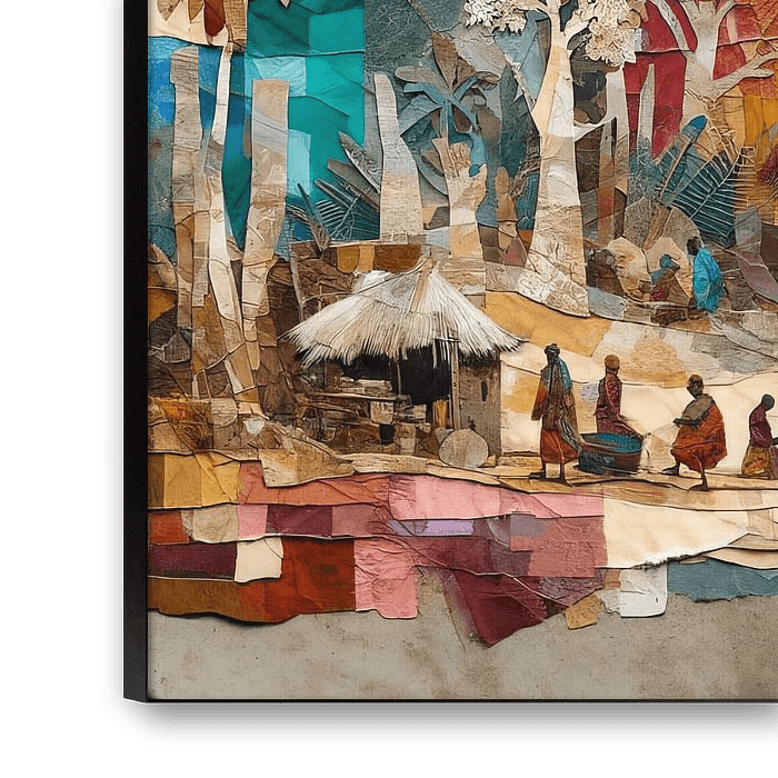 Collage created together with AI. Theme: Senegalese village life under the shade of trees. In southern Senegal, in Casamance, life is wonderfully peaceful, cosy and close to nature. A perfect mix between traditional and modern. Because people are superbly educated, everyone has a mobile phone and you can be in the city in no time. People celebrate life and family.