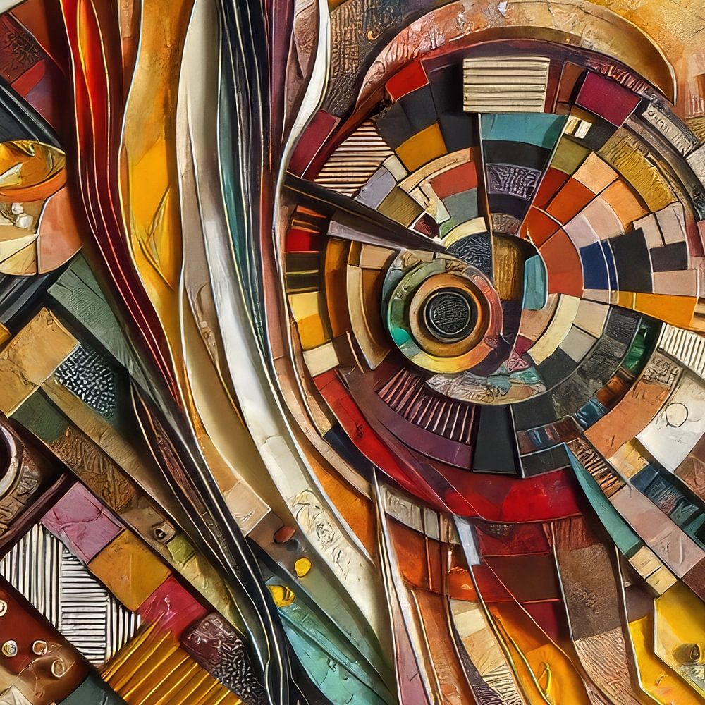 A dynamic and complex abstract collage that exudes a sense of movement and rhythm. Music. The composition appears centred around a spiral or circular pattern reminiscent of an abstract interpretation of a musical instrument or machine part, with various elements radiating from this central point.