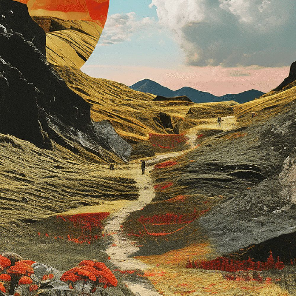 This impressive picture is a collage depicting a surreal landscape in a rocky valley. A winding path leads through a hilly, green landscape flanked by rock faces. Large, bright red and yellow flowers are placed in the foreground, lending the picture an explosive depth of colour. A huge, disc-shaped, sun-like structure with radial patterns dominates the upper left edge. Fluffy, whimsically shaped clouds float in the sky. The entire composition looks like a dream, created by a fascinating mixture of real landscape and abstract, graphic elements.