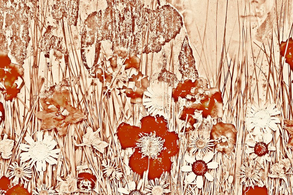 Combinatie van twee heel verschillende foto's die na samenvoegen en enige bewerking een verrassend beeld opleverden. Op de achtergrond een foto van een gescheurde poster op een huis in Portugal, op de voorgrond een foto van een collage van gedroogde bloemen.