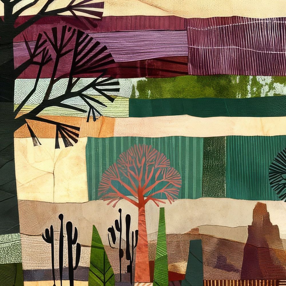 The background is seemingly made up of pieces of semi-transparent paper or textiles. It gives the effect of a patchwork quilt. The trees appear to be drawn and pasted on it.