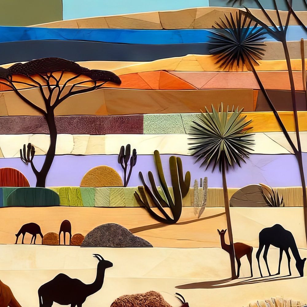 Collage created together with AI. Theme: Senegalese landscape with baobab trees and all kinds of cervids and bucks. Light inspired by the Bandia nature reserve. Besides giraffes, white rhinos, oryxes, buffaloes, monkeys, ostriches, crocodiles, tortoises and zebra's, this wildlife park is home to many antelopes, kudu's, impala's, gazelles and bucks. And lots of magnificent birds. But what I love most of all are the trees: giant baobabs and fairytale acacia's.
