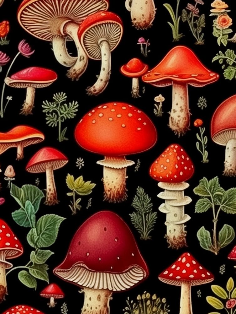 Collage of red mushrooms rendered in watercolour.