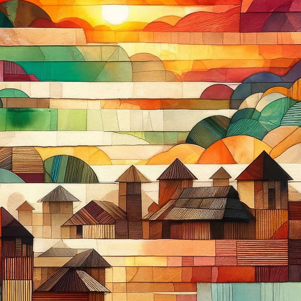 An idyllic and colourful collage depicting a landscape of rolling hills and a rural village during sunset or sunrise. The hills and sky are made up of horizontal strips in a range of colours, including red, orange, yellow and various shades of green, creating a warm and atmospheric light. The middle section of the collage represents the sun, whose rays spread through the sky, creating a radiant effect.