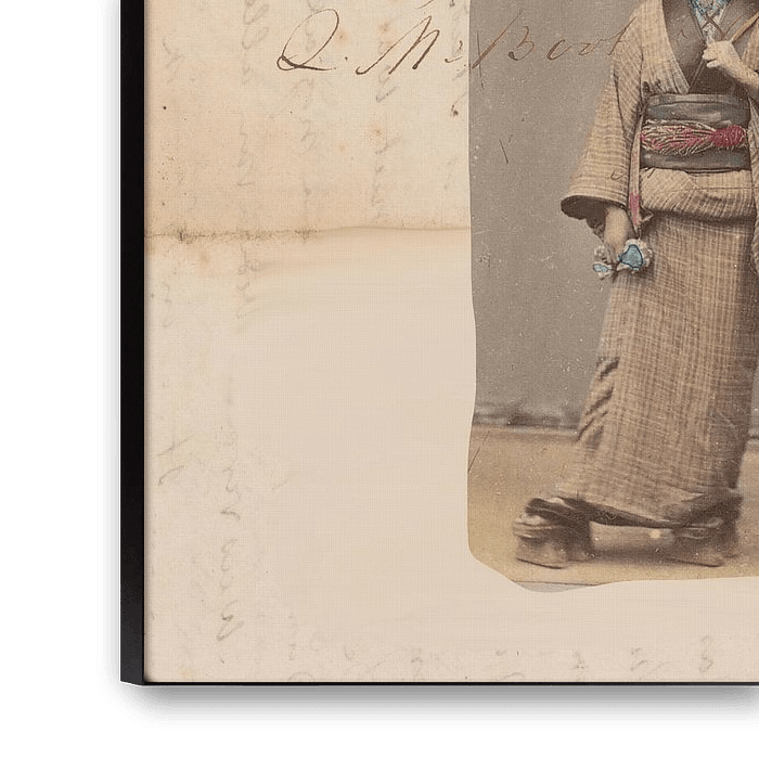 Vintage collage of old materials: letter, envelope and image of a Japanese lady in earth tones with light colour accents. Beautiful when printed on large canvas.