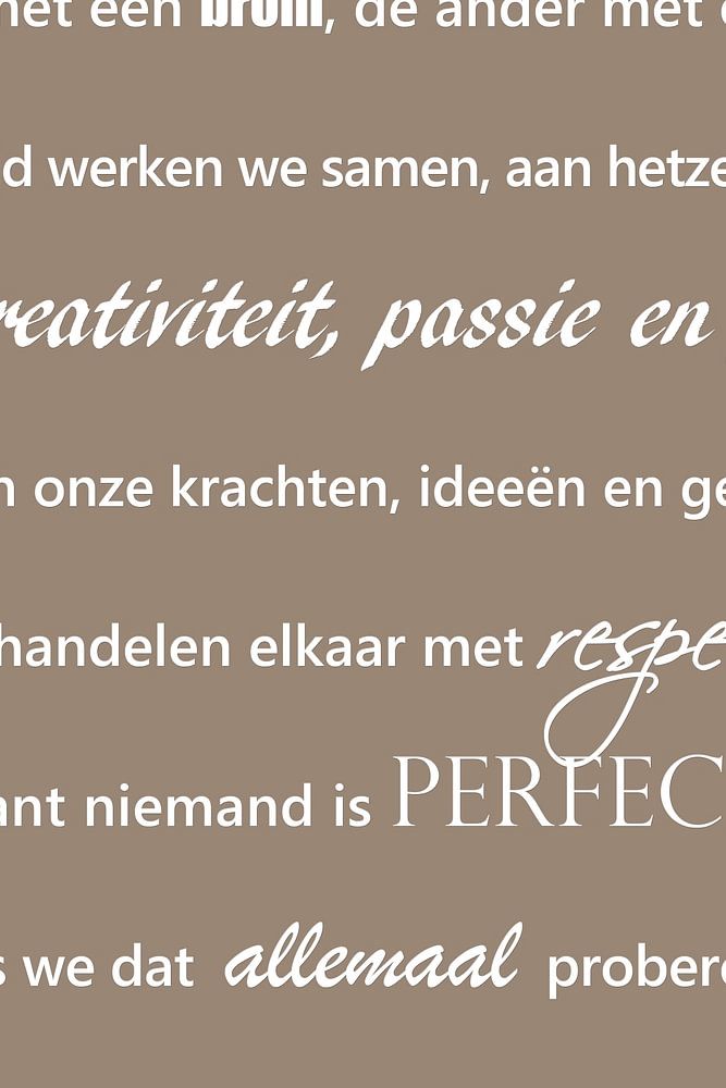 Colleagues. Together we start the day. The background colour is light brown, the letters are white. Text on canvas or other material