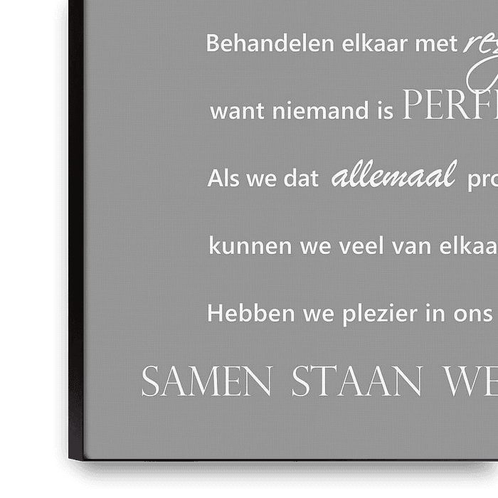 Colleagues. Together we start the day. The background colour is light grey, the letters are white. Text on canvas or other material