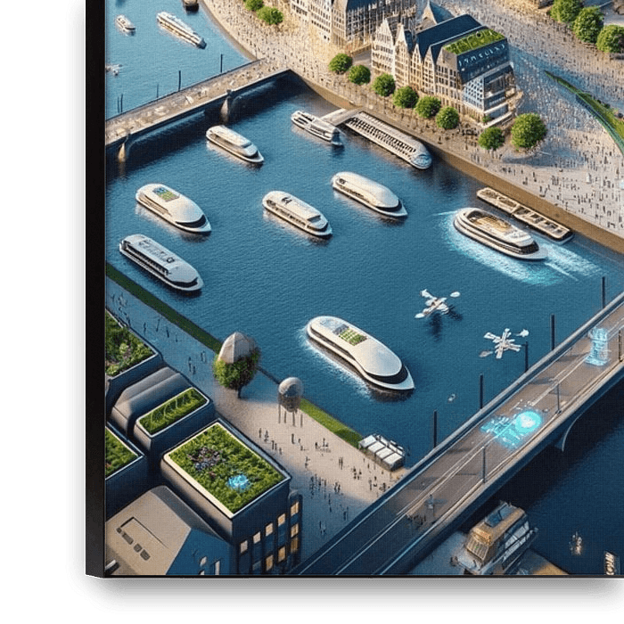 This modern digital poster shows a visionary future interpretation of the city of Cologne, in which centuries-old history and ultra-modern urban development merge in perfect harmony. Cologne Cathedral - the city's unmistakable landmark and cultural heart - rises majestically in the centre of the motif. It is surrounded by a futuristic…