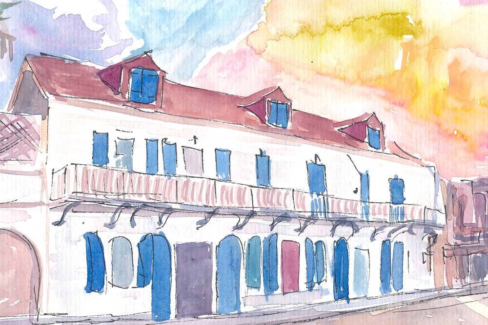 Buy this painting Colonial street scene in Marigot Saint Martin in French Caribbean by Markus Bleichner as a reproduction on canvas, ArtFrame, poster and wallpaper, printed on demand in high quality.