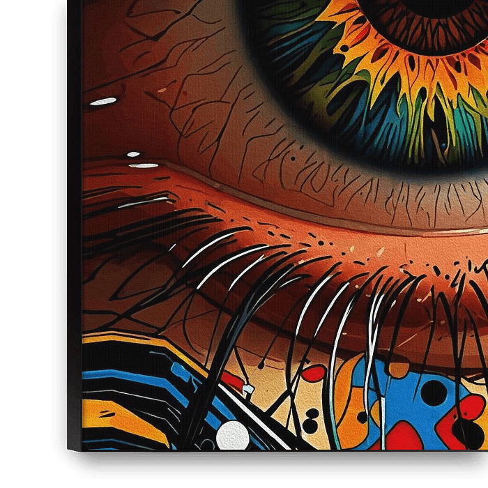 This captivating wall art showcases a stunning close-up of a human eye bursting with vibrant colors and intricate details. The swirling mix of blue, orange, yellow, and red paint creates a powerful symbol of vision, creativity, and emotional depth.
