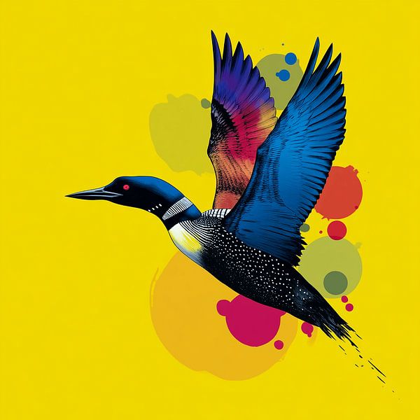 Stylish illustration of a brightly coloured bird in flight with blue and pink wings against a yellow background with paint splashes.