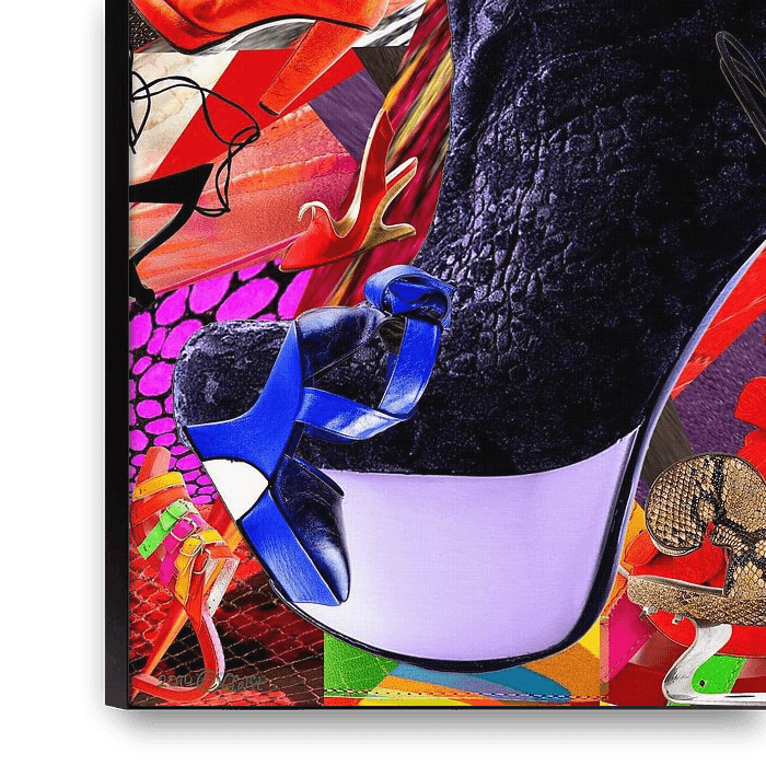 Colorful digital artwork consisting of many Dutch Design shoes and details of which the art shoes are made. Leather, metal, heels, laces etc. A quest for shoe artworks.