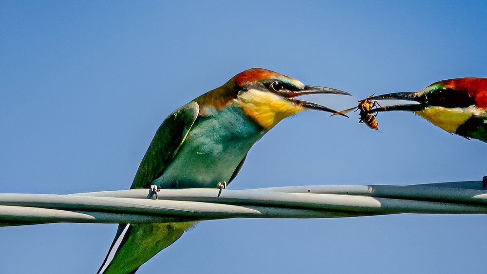 In the heart of beautiful Tuscany, where the sun-drenched hills form a picturesque backdrop, we witnessed a special moment in nature.This beautifully coloured bee-eater, with its vibrant blue and yellow hues, is here patiently feeding a hungry chick. It's a scene that perfectly captures the essence of the natural cycle and the beauty of parenthood. This holiday in Tuscany will stay with us for a long time because of this.