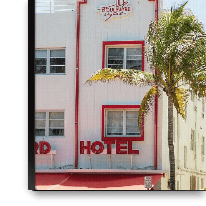 A photo print of colored hotels in the Art Deco district of Miami, Florida. Ocean Drive is home to a lot of beautiful architecture in beautiful pastel colors.