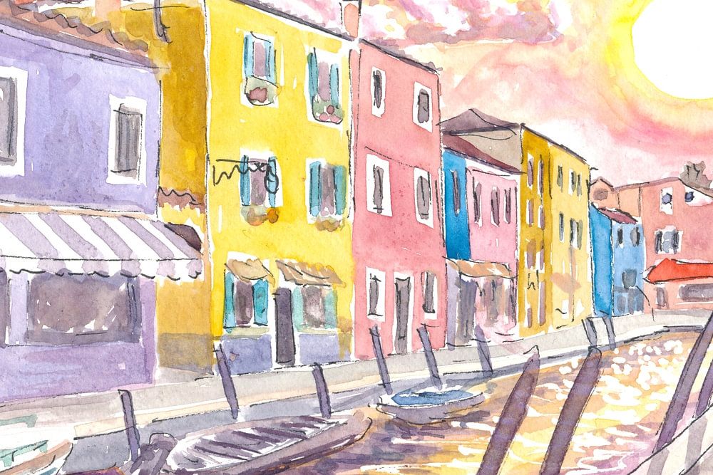 Buy this painting Colorful Burano canal with stores and sun reflections on canal by Markus Bleichner as a reproduction on canvas, ArtFrame, poster and wallpaper, printed on demand in high quality.
