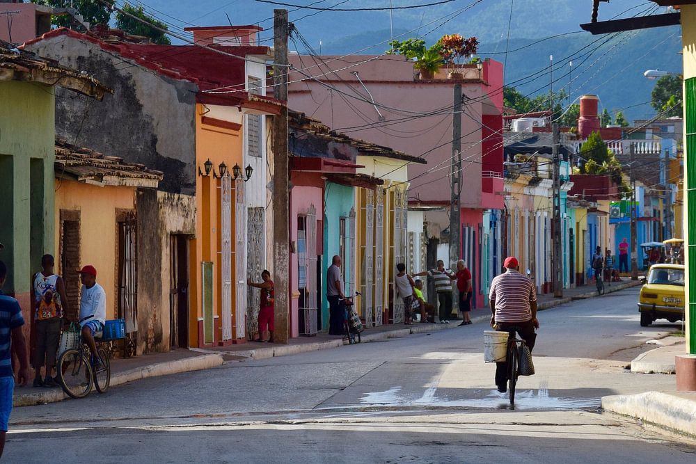 Picture of street life in Cuba's oldest colonial town, Trinidad. The iconic pastel-coloured houses give the photo a lot of colour and a cheerful look.
