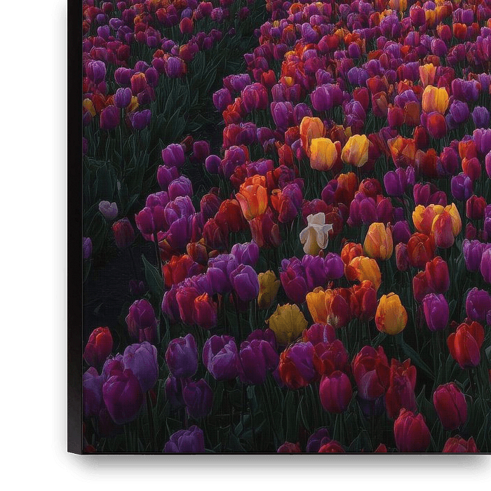 Endless rows of vibrant tulips stretch across the Dutch countryside, glowing softly in the warm light of sunset. A traditional windmill rises on the horizon, creating a timeless and serene atmosphere that captures the essence of the Netherlands.