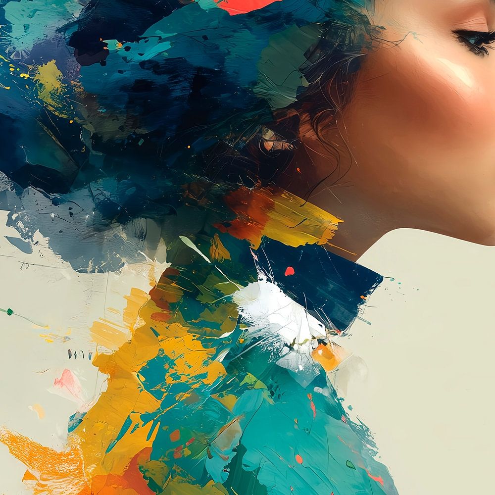 A portrait of a woman with vibrant abstract paint strokes flowing from her head creating a dynamic and artistic effect against a soft beige background. The woman's facial features are softly defined and exude a serene and contemplative expression.