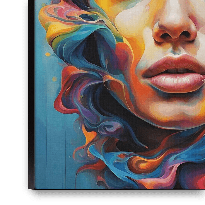 In this work, you see a face in close-up, framed by an explosion of vibrant colours and flowing shapes. The eyes seem to look straight through you, while the colours create a soothing movement.