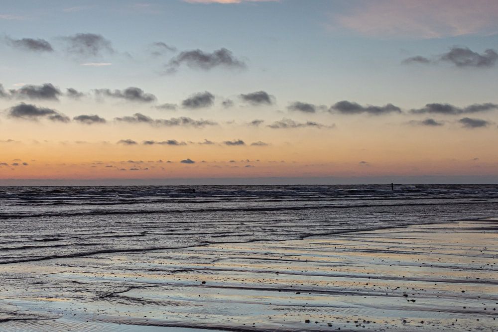 Coastline of North Sea and Wadden Sea just after sunset The sky and clouds are full of color These colors reflect on the wet beach.
