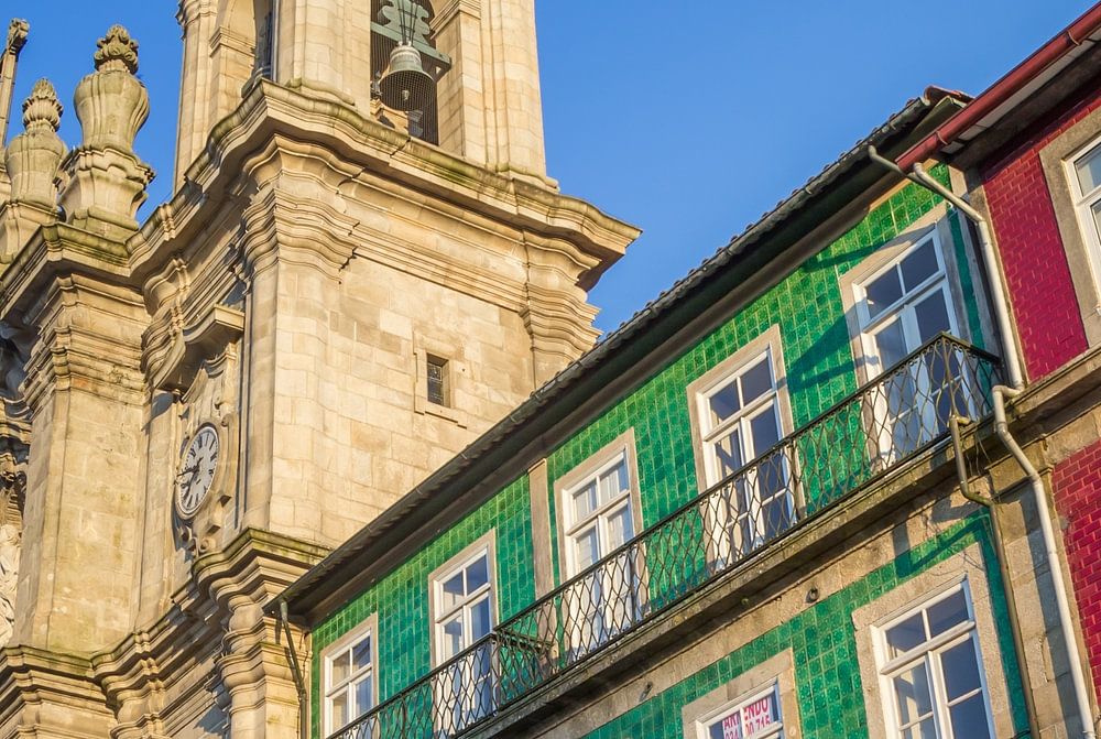 Colourful tiles on the facades of houses and the towers of a monastery in Braga, Portugal