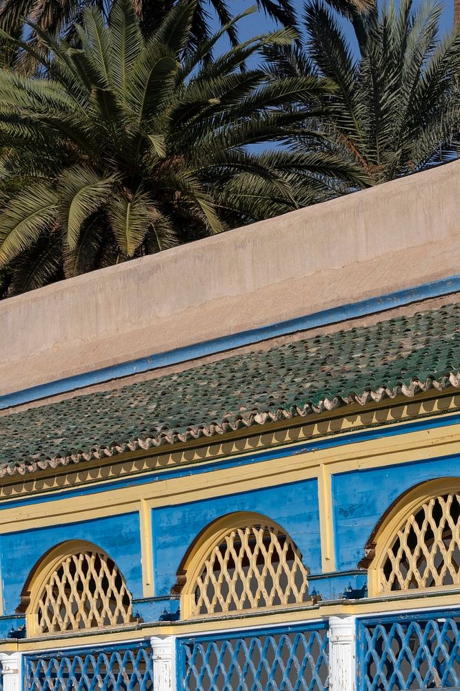 The colors combine beautifully, the blue of the building comes back in the blue sky. The green of the roof, comes back in the palm trees. The yellow is in nice contrast with the blue and the white beams keep the image balanced and fresh.