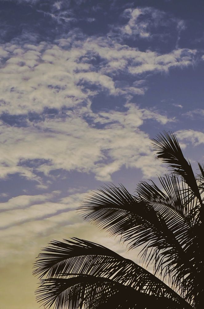 Summer atmosphere: beautiful colors in the sky, a few minutes before sunset. The light making the silhouette of the palm trees stand out. Scene taken in the beach of an island in the Caribbean.