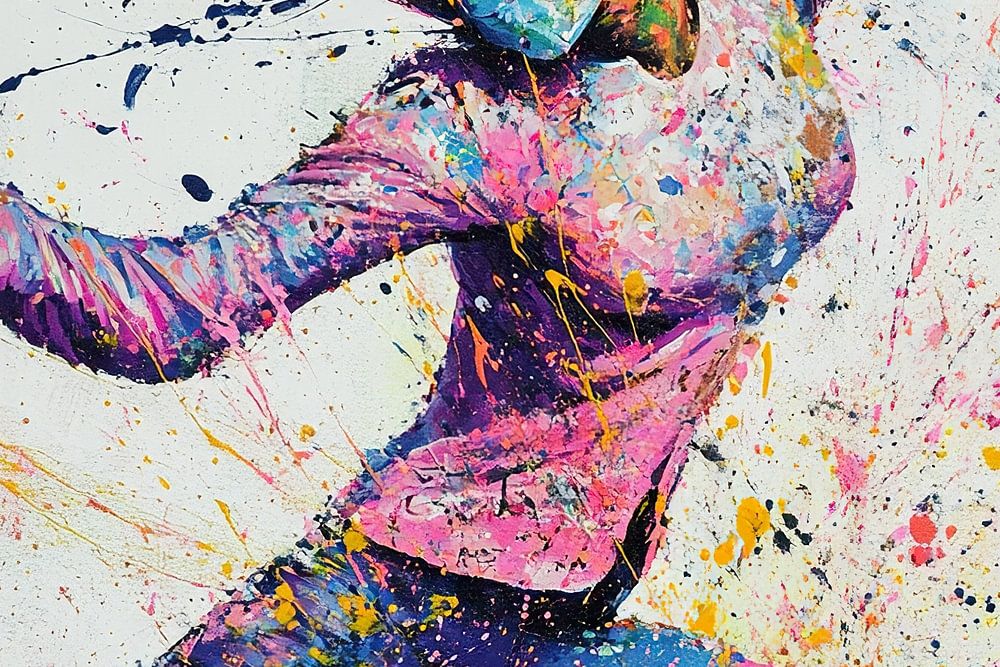 Dance of colours | Vivid Motion - This dynamic women's painting shows a vibrant figure in motion, covered in splashes of bright colours against a white background, exuding a sense of joy and freedom.