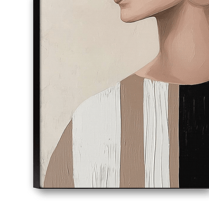 A modern abstract painting of a female portrait in beige, grey tones. Minimalist, but also an eye-catcher. Fits nicely in a calm interior, or in a colourful interior to add more tranquillity.