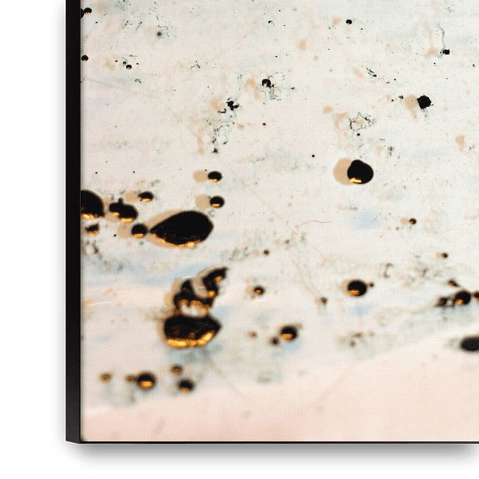 This artwork features numerous white splashes against a white background, which at first appear almost to be floating and only reveal themselves as oil forms upon closer inspection. A subtle, almost poetic tension arises between materiality and lightness. The surface appears calm and minimalist, yet at the same time full of movement. …
