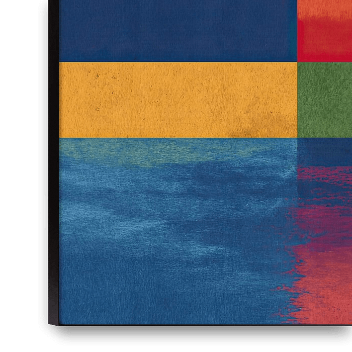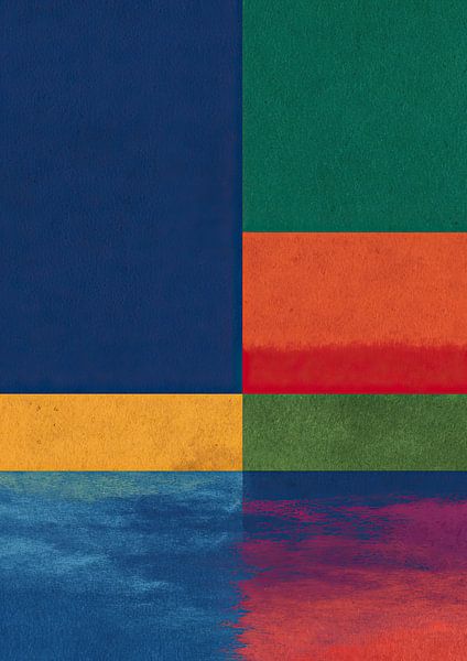 This abstract composition consists of four evenly arranged quadrants in a 2x2 grid. The colour palette combines a deep dark blue with vibrant leaf green, warm sunflower yellow and a bold tomato red. While the blue field has a smooth, uniform surface, the other fields feature a distinctive, grainy texture with subtle variations in tone…
